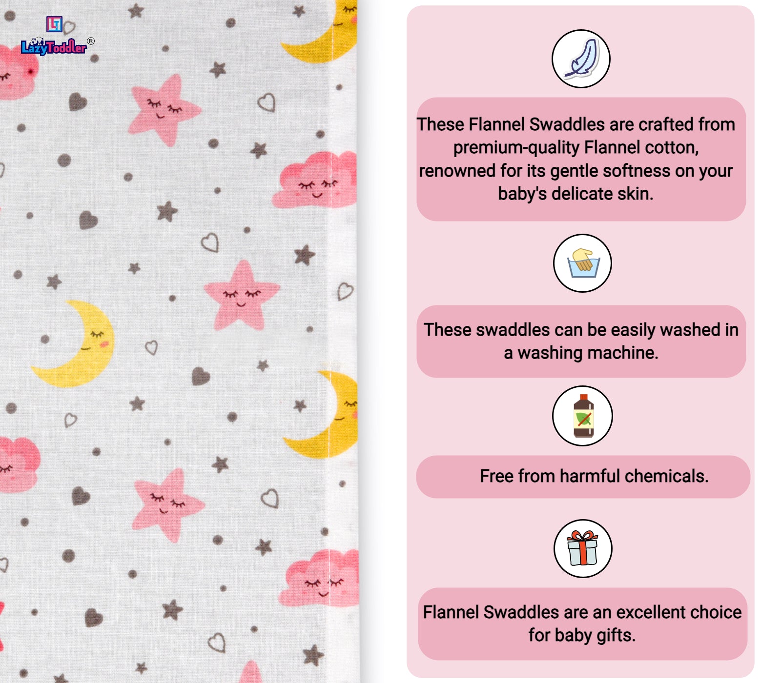 Snuggle your baby tight before they get older. The best swaddles come from Lazy Toddler! Yes... Babies feel snuggled when they are wrapped in our warm flannel swaddles. The best gift to a newborn since they love being associated with their mother's as they are in there for 9 months in a warm and cozy environment. We take full care to provide you the best quality of flannel, each thread woven with love. Our flannel swaddle is designed to provide comfort and security to your little one. Wrap your baby in pure softness. Our high-quality 100% cotton flannel with cheerful designs gets softer with every wash.