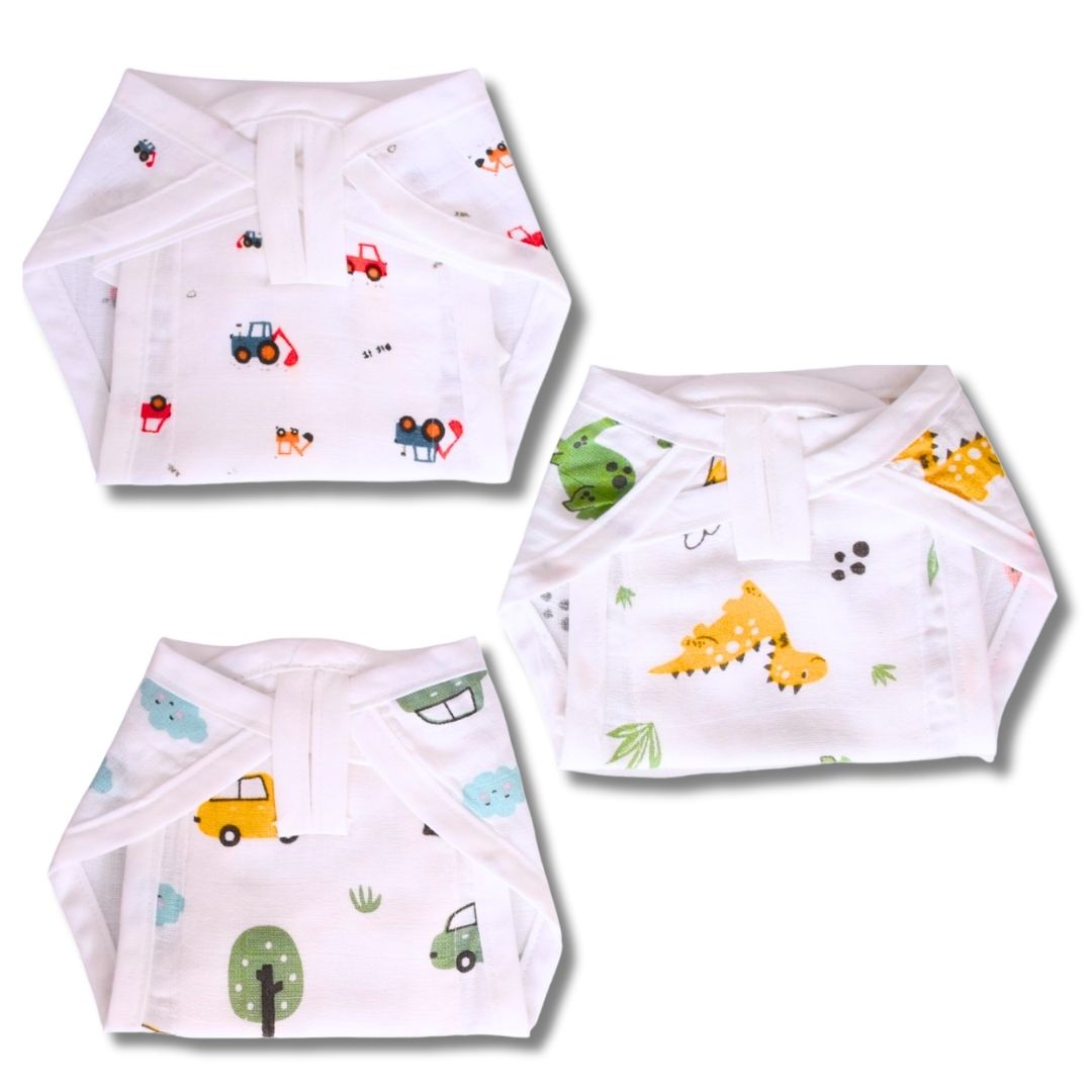 Lazytoddler Muslin Padding Nappy (Crane , Dino , Car) – Pack of 3