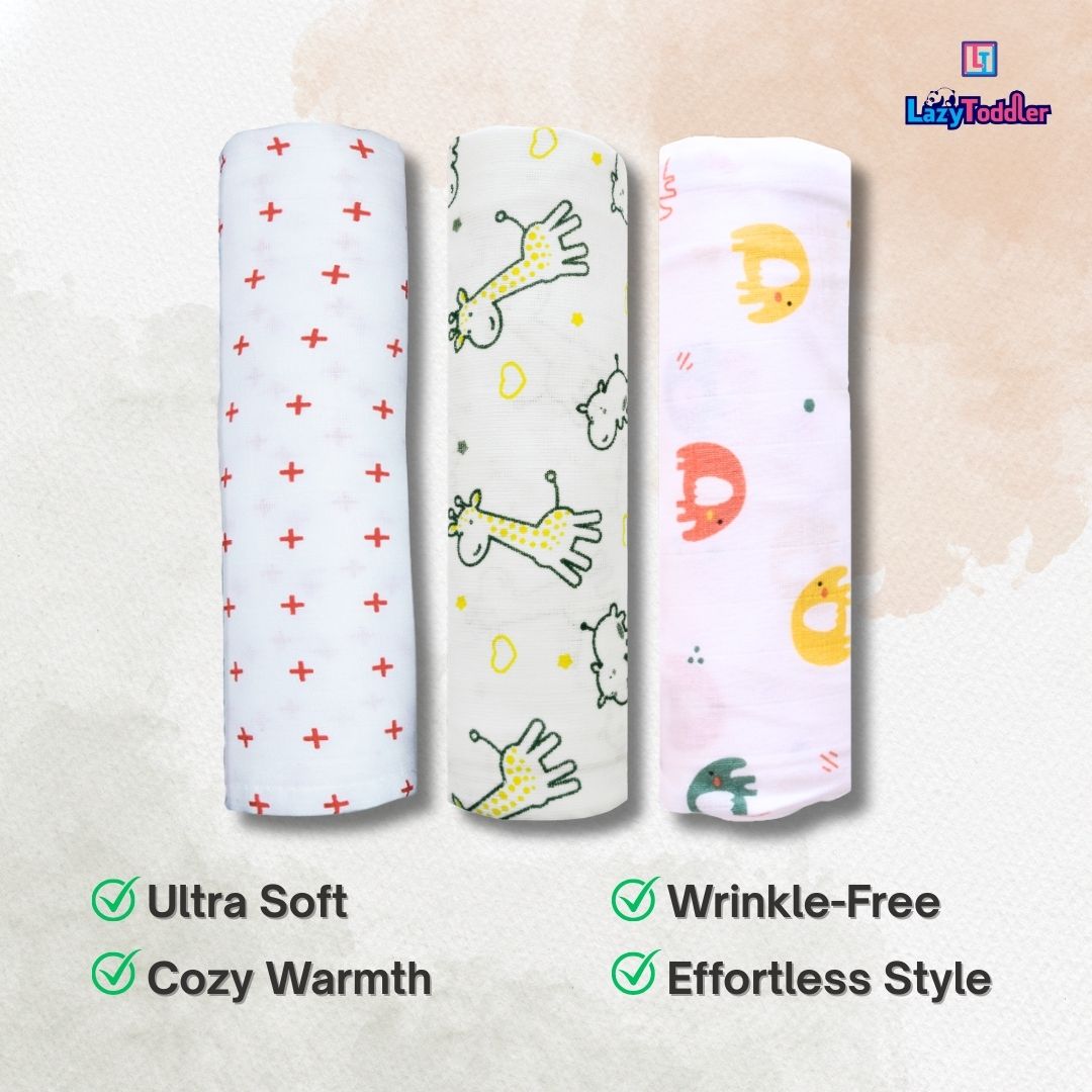 Lazytoddler Muslin Swaddle Printed Design (Red Plus , YC , Elephant) Set of 3