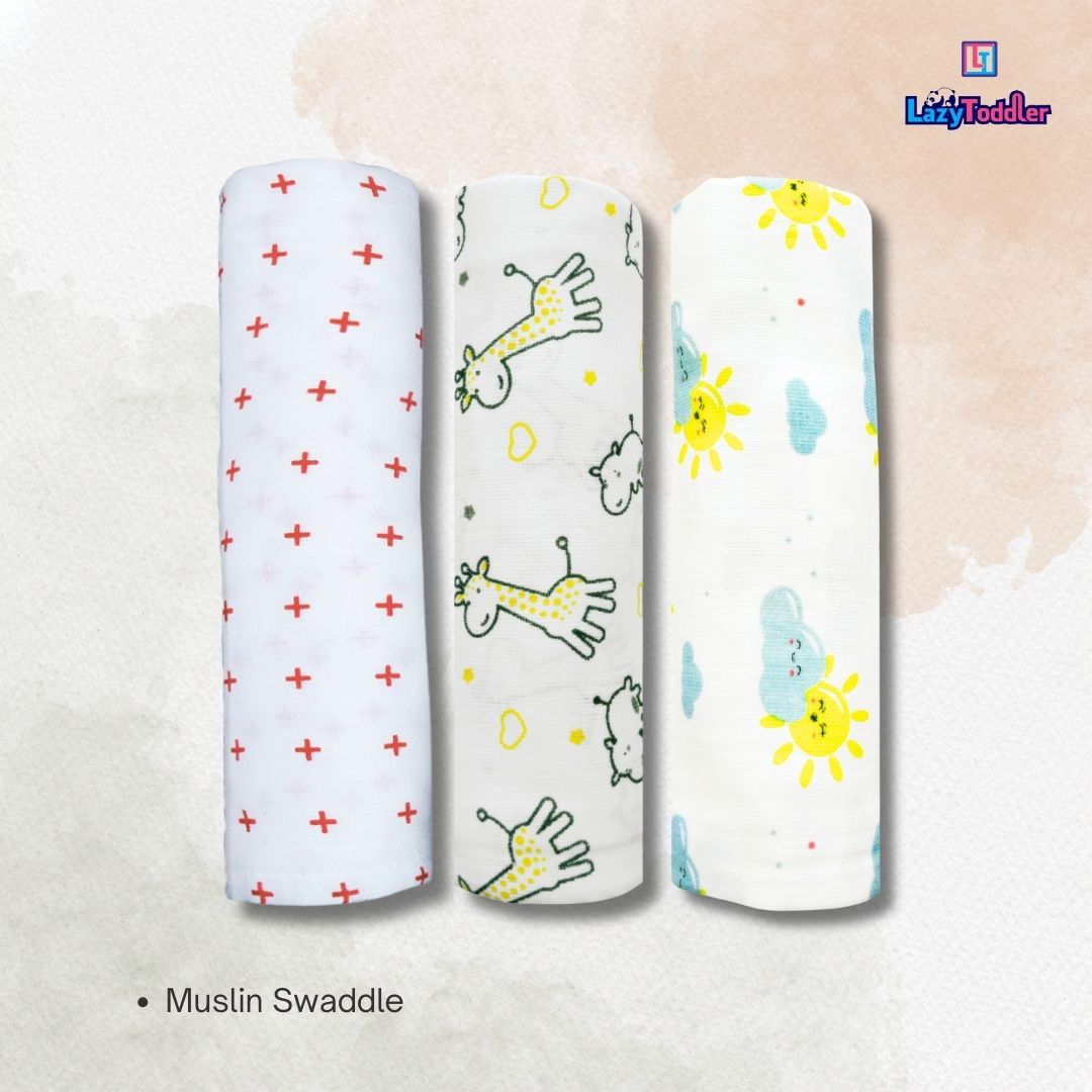 Lazytoddler Muslin Swaddle Printed Design (Red Plus , YC , Sun) Set of 3