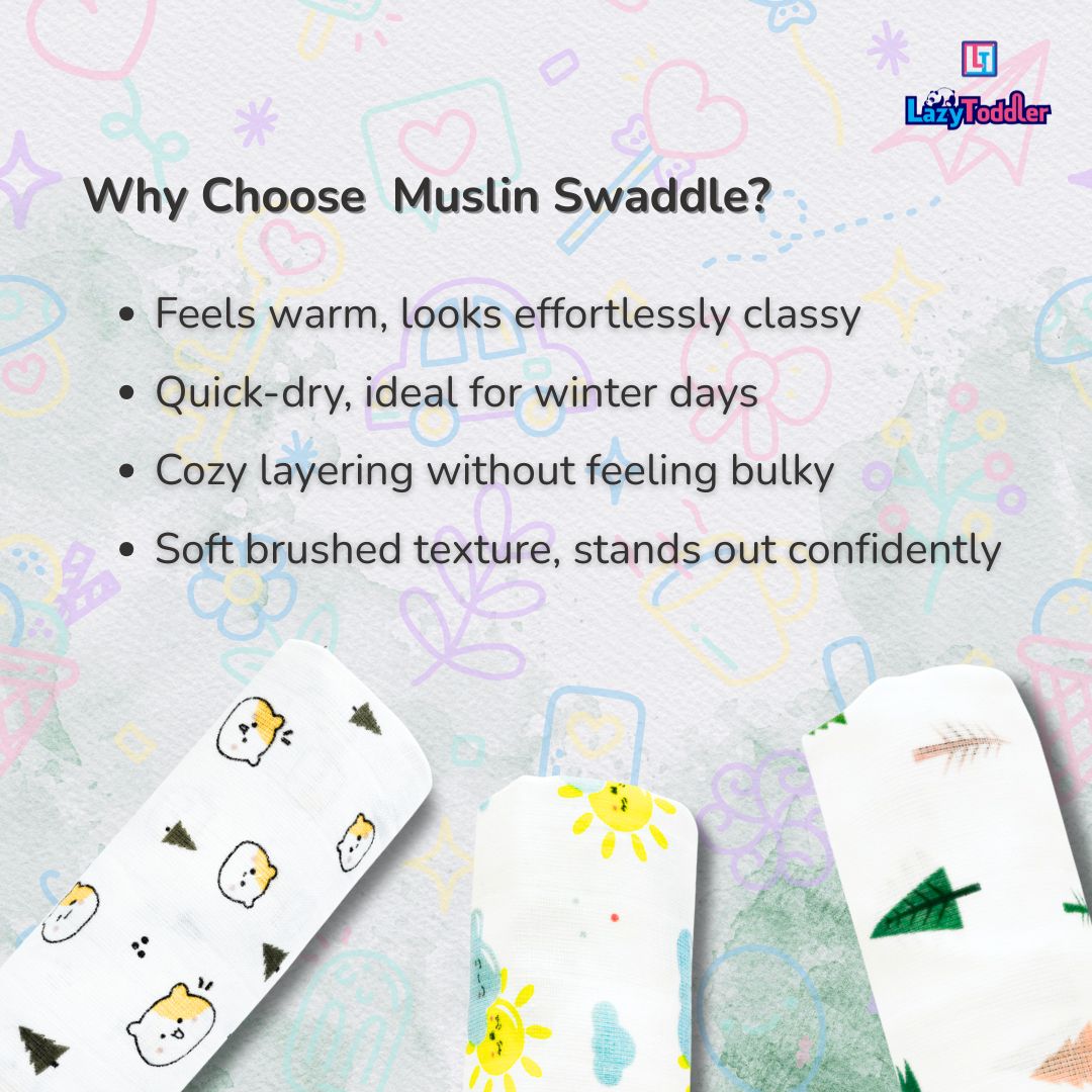 Our Muslin swaddle is designed to provide comfort and security to your little one. Wrap your baby in pure softness. Our high quality 100% cotton muslin with cheerful designs gets softer with every wash.