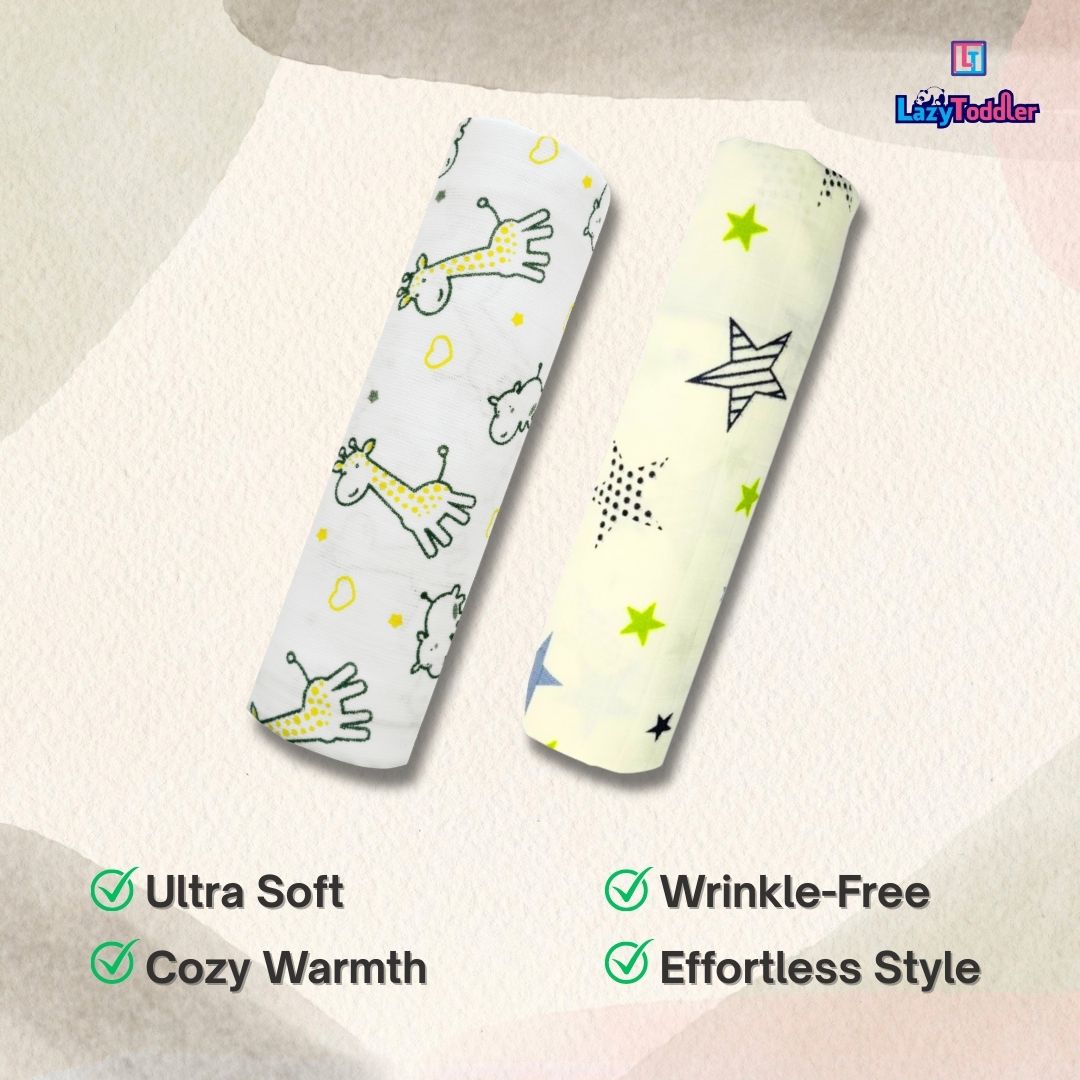 Lazytoddler Muslin Swaddle Printed Design (Yellow Camel , New Star) Set of 2